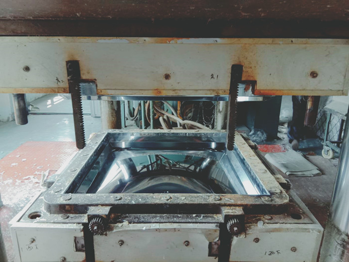 把稱重完成的片材放入模壓機內,經過一定的高溫模壓,才能形成水箱板。而水箱板表面的光滑程度主要取決于水箱板磨具,故此,一個好的水箱磨具也是至關重要的,而水箱板的厚度決定了模壓的時間,水箱板越厚模壓時間越長。